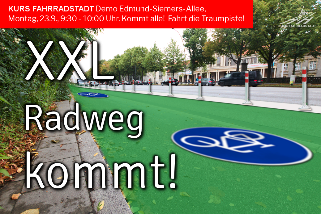 […] Und die nächste Demo: Die Initiative KursFahrradstadt lädt am Montagmorgen zum Radeln auf der Edmund-Siemers-Allee. Dort wird zwischen 9.30 Uhr und zehn Uhr die rechte Fahrbahn zur Veloroute. Es wird um zahlreiche Teilnahme gebeten. Ursprünglich sollte die Aktion während der ganzen Klimawoche durchgezogen werden, was am Bezirksamt Eimsbüttel gescheitert sein soll. Sicher zum letzten Mal, bevor dort die Grünen und die CDU die Verkehrswende umsetzen. kursfahrradstadt […]