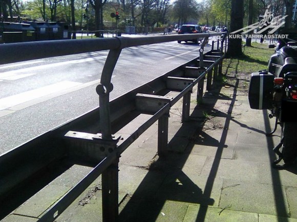 Sich die Unfallstelle genauer anzusehen, ist wirklich bitter. Denn dann fällt auf, wie überdimensional breit der Fußwegbereich an dieser Stelle unter der U-Bahnbrücke ist. Es fehlt nicht viel, und er ist ähnlich breit wie die Fahrbahn an sich. Schön abgetrennt mit einem mehr als robusten Geländer zur Fahrbahn hin. Wäre der Radweg hier hinter verlaufen, anstelle direkt neben dem LKW auf der Fahrbahn und hätte die Radfahrerin weiter rechts im Fußgängerüberwegbereich in die Bebelallee abbiegen können, wäre der gestrige Tag wahrscheinlich ganz anders ausgegangen.