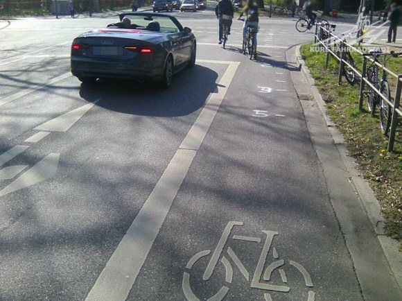 Eine bessere Stelle, die den ganzen Wahnsinn und die Gefährlichkeit einer solchen Fahrradinfrastruktur aufzeigt als diese, kann es kaum mehr geben.