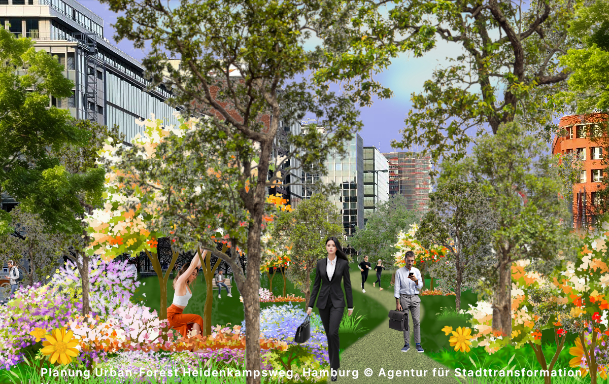 „Urban Forest“ nennt sich das neue Konzept aus der Hamburger Behörde für Umweltschutz und Energie, welches die Mitarbeiter in den letzten Monaten den entsprechend zuständigen Fachabteilungen in den Hamburger Bezirken vorgestellt hat. „Klimastraßen“ – auch „Blue-Green-Streets“ genannt, sind bereits in der Umsetzungsphase, so beispielsweise die Königstraße in Altona. Es geht darum, dass Wasser nicht einfach abläuft, sondern Versickerungsflächen findet, in denen es gespeichert wird bei gleichzeitiger Begrünung der Straßenflächen. International wird das Prinzip in immer mehr Metropolen verstärkt unter Fachleuten, Stadtplaner:innen und Landschaftsarchitekt:innen diskutiert und findet regen Zuspruch in den städtischen Verwaltungen. In Kopenhagen läuft die Umgestaltung der bisher 8-spurigen Hauptverkehrsstraße Vesterbrogade unmittelbar vor dem Hauptbahnhof zu einer neuen Klimastraße mit Stadtwald. Neben Paris experimentiert auch Wien mit den Straßen der Zukunft und testet – ebenfalls in unmittelbarer Bahnhofsnähe – als Vorstufe erfrischende Pools auf bisher breiten Straßen in der Innenstadt aus.