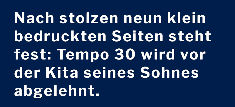 Lange vor SUPERBÜTTEL, begann Fabian sich ebenfalls mit diesen Straßen zu beschäftigen. Damals ging sein Sohn in eine der Kitas. Für den engagierten Vater war schnell klar, dass der viel zu schnell vorbeirauschende Verkehr verlangsamt werden muss. Er beschloss im März 2017, den vom adfc vorgeschlagenen Weg über Lärmschutz und Luftverschmutzung zu gehen, um das Ziel, Tempo 30 einzuführen, zu erreichen. Damals waren dies die einzigen Hebel, die es gab, solange nicht mindestens ein Mensch an exakt diesen Orten durch einen Unfall ums Leben gekommen war. Es klingt zynisch, doch erst dann liegt eine erhöhte Gefährdungslage vor. 2019 klagte er schließlich vor dem Verwaltungsgericht, da ihn die Ablehnungsgründe nicht überzeugten. Sieben Jahre später – im Jahr 2024 hat sein Sohn längst nicht nur die Kita, sondern auch die Grundschule verlassen – fand man wohl doch noch ein paar Tempo 30-Schilder und diese wurden (zusätzlich zu einigen wenigen bereits im Jahr zuvor eingerichteten Tempo 30-Teilbereichen) endlich aufgestellt. Sieben Jahre, in denen man unglaublich viel lernen konnte, wie das in Hamburg funktioniert, das Zusammen- oder besser, das Nicht-Zusammenspiel aus Politik, Verwaltung und Polizei. Letztere ist in dieser Stadt nicht nur für die Einhaltung der Verkehrsregeln, sondern auch für deren Anordnung zuständig. Und eben auch sieben Jahre, die trotzdem nicht reichen, um auch die letzte Kita am Langenfelder Damm, die „Kita Langenfelder Damm“ in gleichnamiger Straße Nummer 97, an der die Autos wie eh und je ungebremst vorbeirasen dürfen, einzubeziehen. Dass das so ist, hat einen Grund: die Tür.