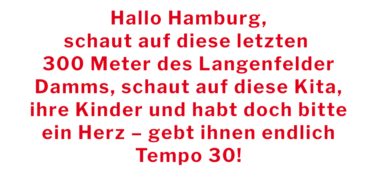 Gab es nicht eine Änderung der Straßenverkehrsordnung, die insbesondere vor Kitas und sozialen Einrichtungen eine Geschwindigkeitsreduzierung auf Tempo 30 erleichtern sollte? Es gibt wahrscheinlich kaum vergleichbare Straßen in Hamburg, die auf so kurzer Distanz, auf gerade einmal 1,5 Kilometern Länge, so viele Kitas beheimaten wie hier: Beginnend in der Lappenbergsallee vom Eimsbütteler Marktplatz / Heußweg kommend liegen das Kinderhaus Fledermaus, Die Sonnenkinder Kita, Vier Jahreszeiten, Kind + Kunst, Lokomotive, Die Früchtchen, Die Minimeter und die Kita Langenfelder Damm, acht insgesamt!