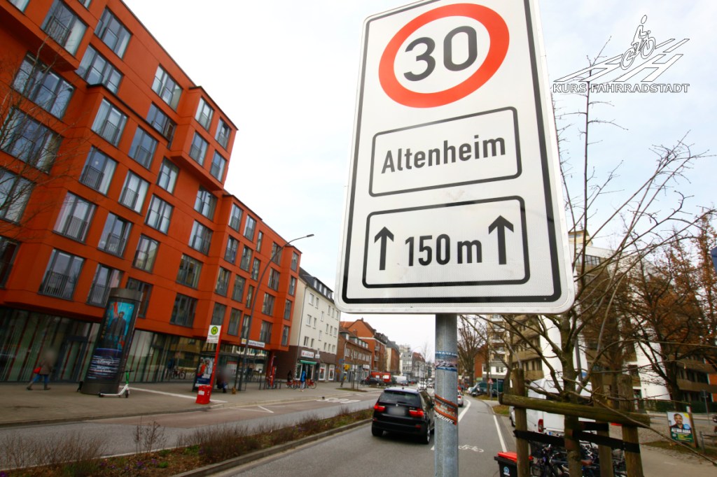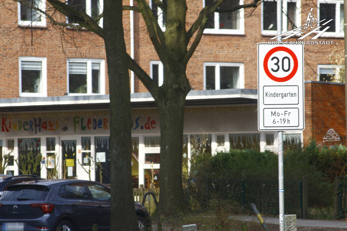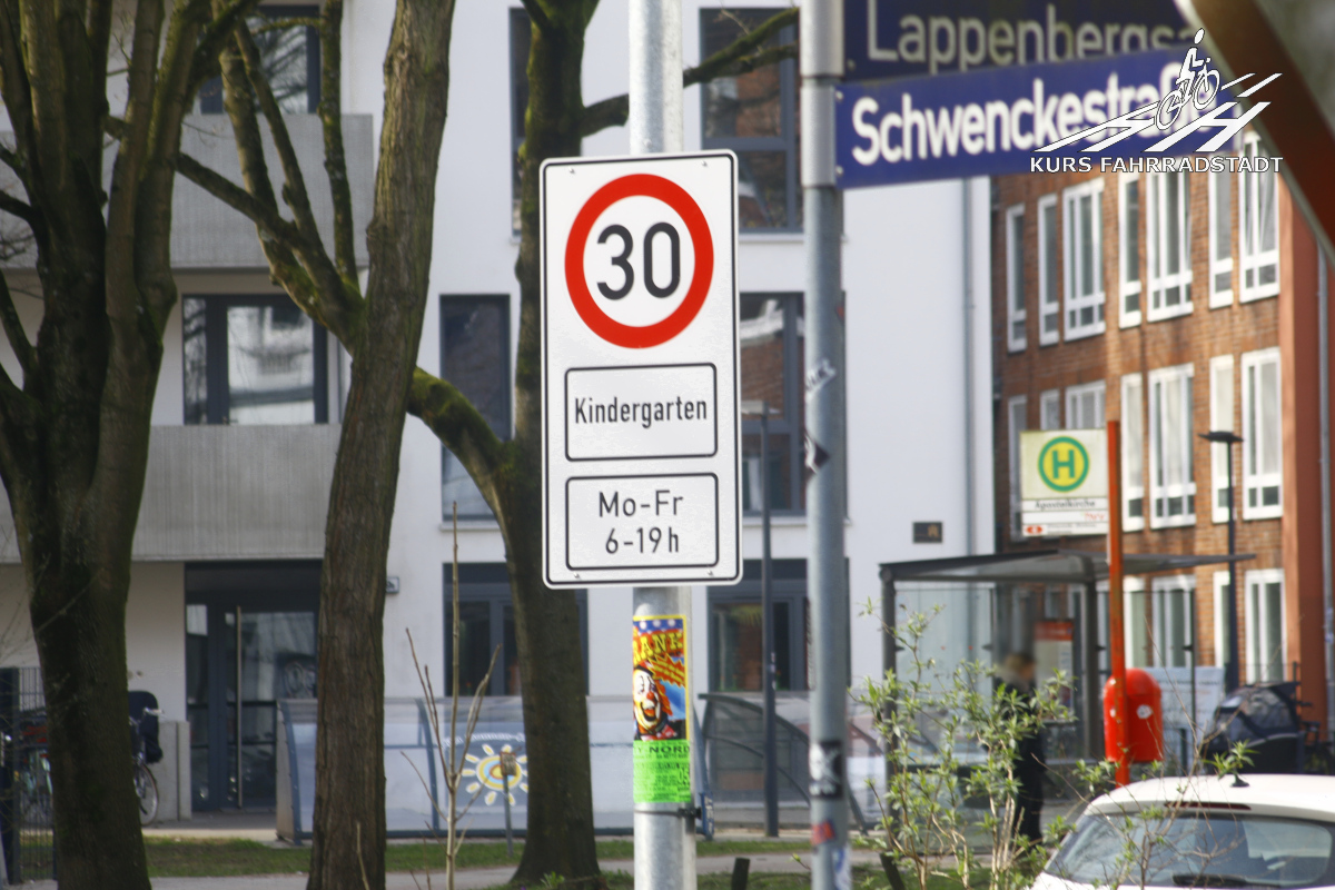 Am 7. Februar 2023 ergeht erstmals eine uns offiziell bekannte Anordnung für Tempo 30 für die Lappenbergsallee, diesmal kommt der Rest der Straße dran, denn auch hier hatte es ganz am Anfang, hinter dem Eimsbütteler Marktplatz vor der ersten Kita bereits seit etwas Längerem erste Tempo 30 Schilder gegeben, die plötzlich aufgetaucht waren. Der Langenfelder Damm dagegen bleibt weiterhin außen vor. Fabian von KURS FAHRRADSTADT wird erneut vorstellig bei der unteren Verkehrsbehörde und beantragt Nachprüfungen vor den restlichen noch „vergessenen“ Kitas vor allem im Langenfelder Damm. Nach und nach ergehen im Laufe des Jahres 2023 weitere Tempo 30 Anordnungen, ohne dass dabei die Schilder zeitnah aufgestellt wurden. Inzwischen ist das passiert und eine ganze Armada Schilder ziert nun beide Straßenseiten: Vor den Kitas gilt nun von Mo – Fr 6 – 19 Uhr die reduzierte Geschwindigkeit (obwohl an den Wochenenden tagsüber mindestens genauso viel los ist, wenn nicht sogar mehr), vor dem Seniorenheim gilt es dagegen an allen Wochentagen rund um die Uhr, vor Spielplätzen ist es egal – (ein anderes Thema – auch hier gilt Tempo 30, allerdings wegen der Kitas, nicht wegen dem gut besuchten Spielplatz) – und im Kreisel, der mitten im Langenfelder Damm liegt, darf munter gerast werden. Direkt vorher wird Tempo 30 aufgehoben, um unmittelbar dahinter wieder angeordnet zu werden. Ach ja, und vor der Kita „Langenfelder Damm“ (gelegen in gleichnamiger Straße Nummer 97), der letzten Einrichtung für Kinder in der langen „Kinderstraße“, dürfen Autofahrende ebenfalls noch das Gaspedal durchdrücken.