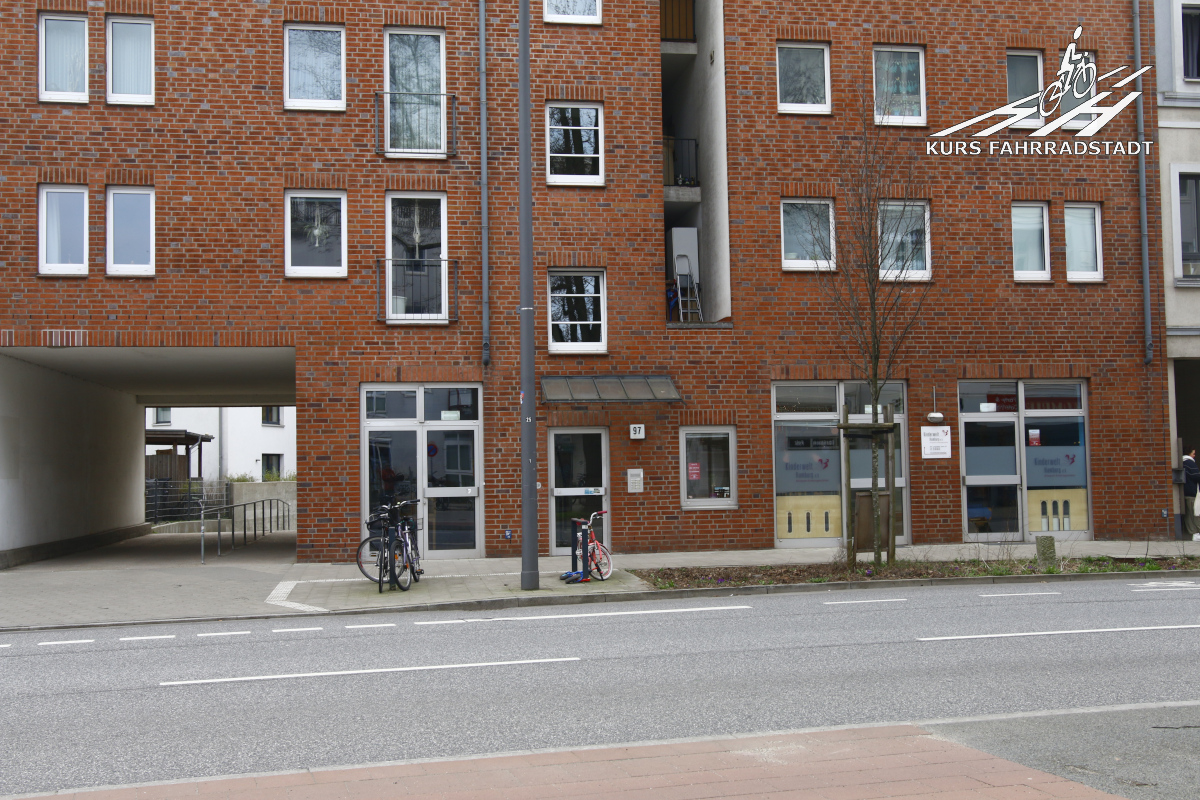 Denn die Tür befindet sich nicht direkt vorne an der Straße, sondern hinter dem Torbogen auf der Innenseite des Hauses, im Hof. Die Tür direkt zur Straße ist genau deshalb dauerhaft verschlossen, weil es viel zu gefährlich ist, einen Eingang in unmittelbarer Nähe der Straße zu haben. Damit ist in in der Sichtweise der Polizei der Anspruch auf Tempo 30 verwirkt, da der Eingang an der Hausseite ausreichend sicher ist. Obwohl alle Kinder nur von der Straße aus in diesen Torbogen zum Eingang gelangen, obwohl sie genauso wie auch alle anderen Kitakinder im Langenfelder Damm hier vorher auf dem Gehweg der selben Straße stehen müssen, obwohl viele Räumlichkeiten der Kita mit Fensterfront bis an die Straße heranreichen, die Kinder die Autos durch sie rasen sehen und ihre Abgase einatmen müssen, wenn die Fenster geöffnet sind, soll es hier weiterhin kein Tempo 30 geben. Und das, obwohl keine der anderen sieben Kitas so nahe (in Metern) an der Bordsteinkante der Straße liegt.