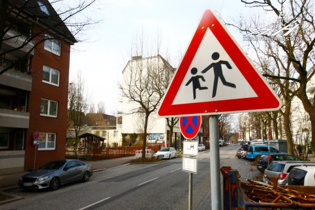 Nicht weit entfernt, im Nachbarstadtteil Lokstedt, wird nun der Grandweg mit einer ähnlichen Sperrung versehen. Genau wie auch die Lappenbergsallee verläuft der Grandweg parallel zu einer sogar „nur“ vierspurigen Hauptverkehrsstraße. Eine Diagonalsperre, die im Mai installiert wird, soll „für Ruhe und Sicherheit“ sorgen, denn auch hier liegt eine (EINE!) Kita direkt an der Straße, eine weitere in der Nähe sowie eine Grundschule, ebenfalls lediglich in der Nähe.