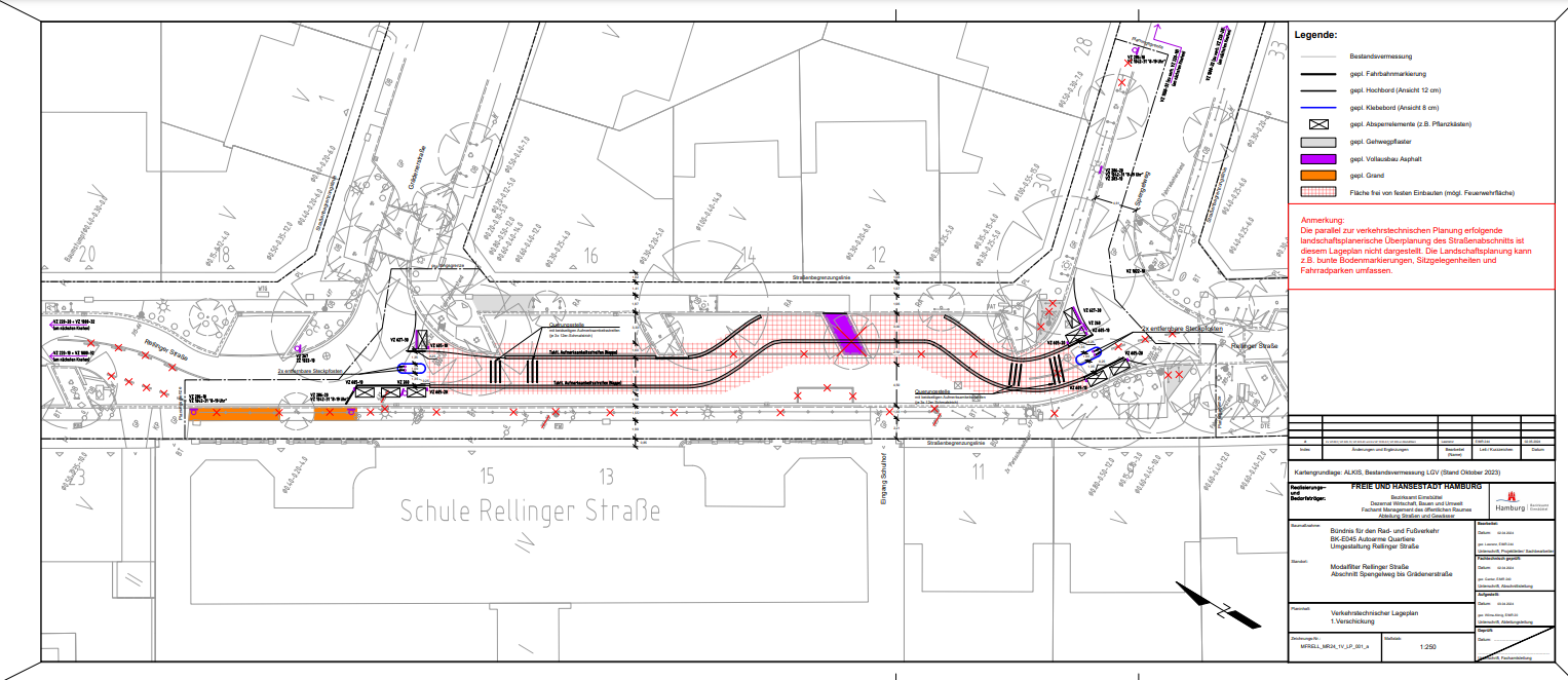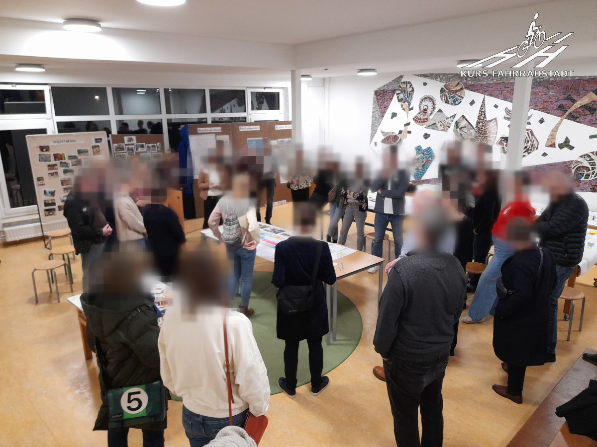 Ende Januar 2024 nimmt das gesamte Beteiligungskonzept immer klarere Formen an. Es wird ein Newsletter „Nachbarschaftsräume Eimsbüttel“ eingerichtet, der von nun an beide Projekte und beide Prozesse begleitet. Zudem bespielen die Klimaschutzleute aus dem Bezirksamt auch regelmäßig Social Media, um die Nachbarschaft und darüber hinaus zu informieren. Mit dem Projekt vor der Schule geht es von nun an unter dem Motto „Vor der Relli soll es schöner werden“ voran: Es wird ein „Arbeitskreis“ ins Leben gerufen und u.a. mittels Newsletter dazu eingeladen. Aus der Schule kamen eine Lehrerin sowie ein Elternteil, vier Bewohner:innen aus der Nachbarschaft, zwei Leute aus der unmittelbar benachbarten noch recht neuen Kulturwerkstatt „Alte Brotfabrik“ sowie wir als impulsgebende Initiative KURS FAHRRADSTADT mit drei Mitgliedern. Zunächst geht es darum, allgemein zu informieren und abzuklopfen, wie genau ein großer Ideen- und Beteiligungsworkshop am sinnvollsten gestaltet und ablaufen sollte. Ebenfalls werden hier die weiteren Bedingungen vorgestellt, die als diskussionslos gegeben sind.
