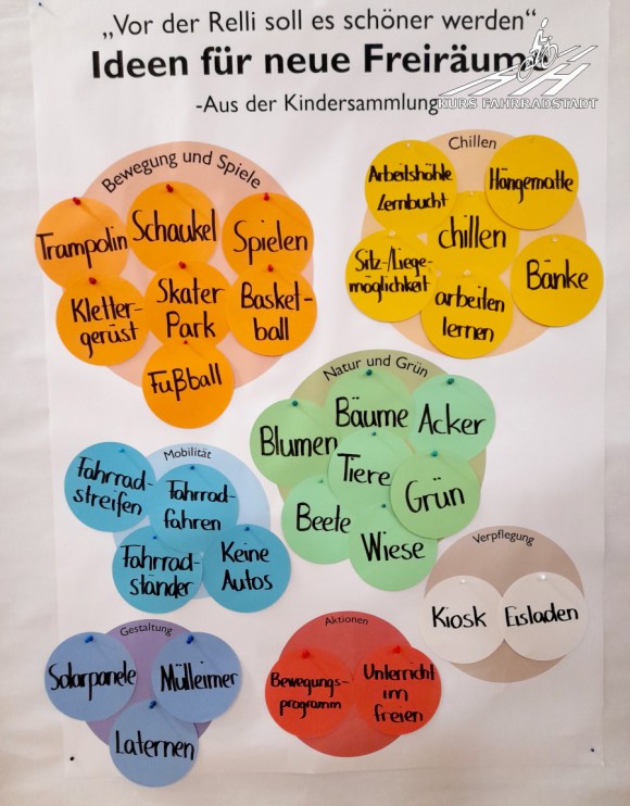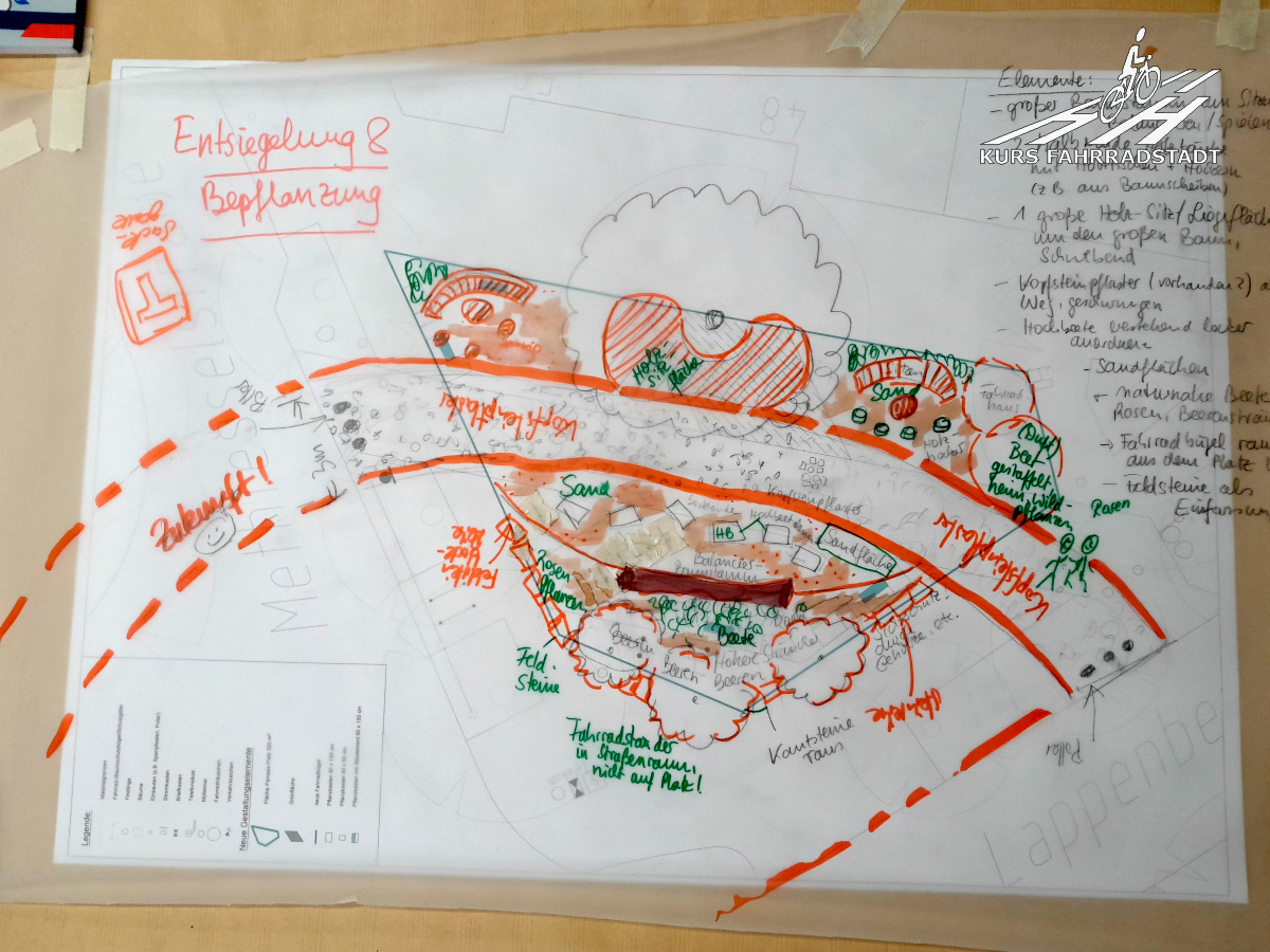 Zunächst wurde darum gebeten, die einzelnen Arbeiten der Kinder zu bewerten. Welche Ideen finden die Erwachsenen gut, welche eher nicht, möglichst mit Nennung von Gründen. Im Anschluss ging es an die eigentliche Planungsarbeit; nun durften die Großen tun, was die Kinder bereits beeindruckend geleistet hatten. Hierbei zeichnete sich ab, dass mehrheitlich eine Verschwenkung des Radwegs gewünscht wird. Auf diese Weise entstehen mehrere breiter (wenn auch nacheinander versetzt) gestaltbare Flächen. Mehr Platz rund um den Schuleingang, mehr Platz auch gegenüber der Schule für großzügigere Begrünungs- und (nachbarschaftliche) Aufenthaltsmöglichkeiten. Als positiver Nebeneffekt bilden die Schwenks an sich bereits eine den Radverkehr verlangsamende Maßnahme. Zwei Leute, die im Fahrradclub organisiert sind, konnten dem Schwenk allerdings so gar nichts abgewinnen. Es ist schade, dass einige noch nicht so richtig verinnerlicht haben, dass Mobilitätswende in all seinen Facetten eben auch bedeutet, Fußverkehr zu stärken. Ein Nachteil der Schwenks ist leider auch, dass dafür ein Baum gefällt werden muss. Alles hat leider seinen Preis. Hier aber haben – im Gegensatz zu vielen anderen Fällen – die Menschen vor Ort selbst und zusammen entschieden, nach reichlichem Abwägen der Möglichkeiten.