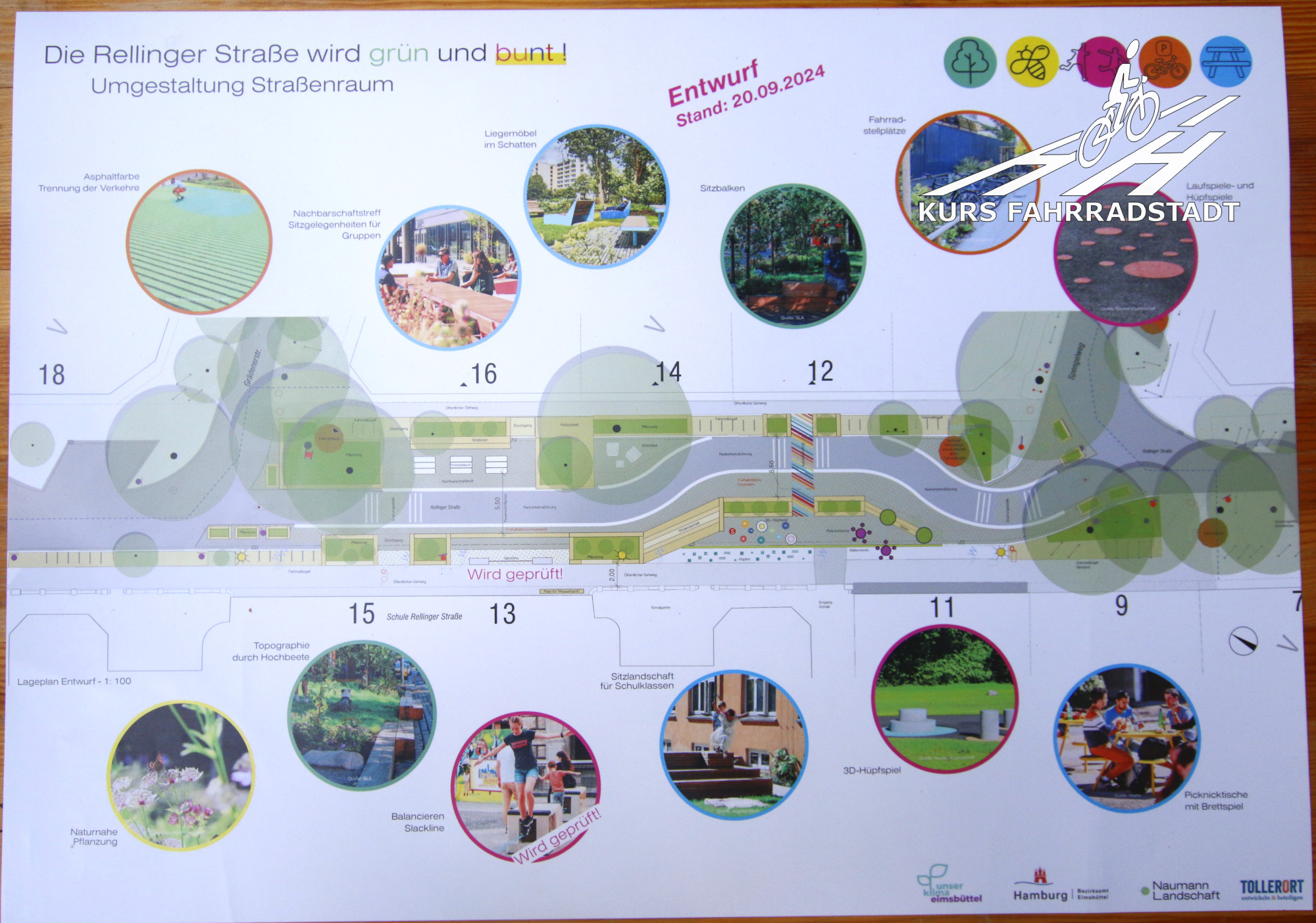 Das EU Projekt Interreg Northsea „Active Cities“, an dem sich die Städte Groningen, Lille, Mechelen, Leeuwarden, Aarhus, Bergen, Lund und Hamburg mit dem Bezirk Eimsbüttel beteiligen, hat es sich zum Ziel gesetzt, Pilotprojekte zu fördern, um urbane und aktive Mobilität zukunftsfähig zu machen, Radfahren und Laufen zu fördern, Straßen sicherer und lebenswerter, Städte wieder gesünder zu machen und somit nebenbei Klimaschutzziele zu erreichen. In der Rellinger Straße beinhaltet das Hamburger Pilotprojekt Schulmobilität sowie Straßenraumumgestaltung und damit schließt sich der Kreis, weshalb dieses Projekt als „Putting citizens at the heart of Active Cities“ im Rahmen der Active Cities angegangen wird. Für uns als SUPERBÜTTLER ist allerdings die Nachricht, dass Radverkehr an dieser Stelle ein wesentlicher Bestandteil der neu zu gestaltenden Fläche bleiben wird etwas, wovon wir zunächst nicht so genau wissen, was wir davon halten sollen. Wir dachten dagegen vor der Schule ursprünglich eher an einen Bereich, der natürlich von Radfahrenden benutzt, aber dennoch in erster Linie Fußgängern vorbehalten sein sollte. Auf dem zweiten Blick und als KURS FAHRRADSTADT nehmen wir die Herausforderung selbstverständlich an und mittlerweile sind wir sehr gespannt, wie sich die drei Hauptbedürfnisse (Fuß-, Radverkehr bei gleichzeitigem Aufenthaltsbereich) an diesem Ort so kombinieren lassen, dass Sicherheit trotzdem für alle gewährleistet werden kann. Als Ausblick auf die nächsten Schritte wird auch hier ein umfangreicher Beteiligungsprozess angekündigt.