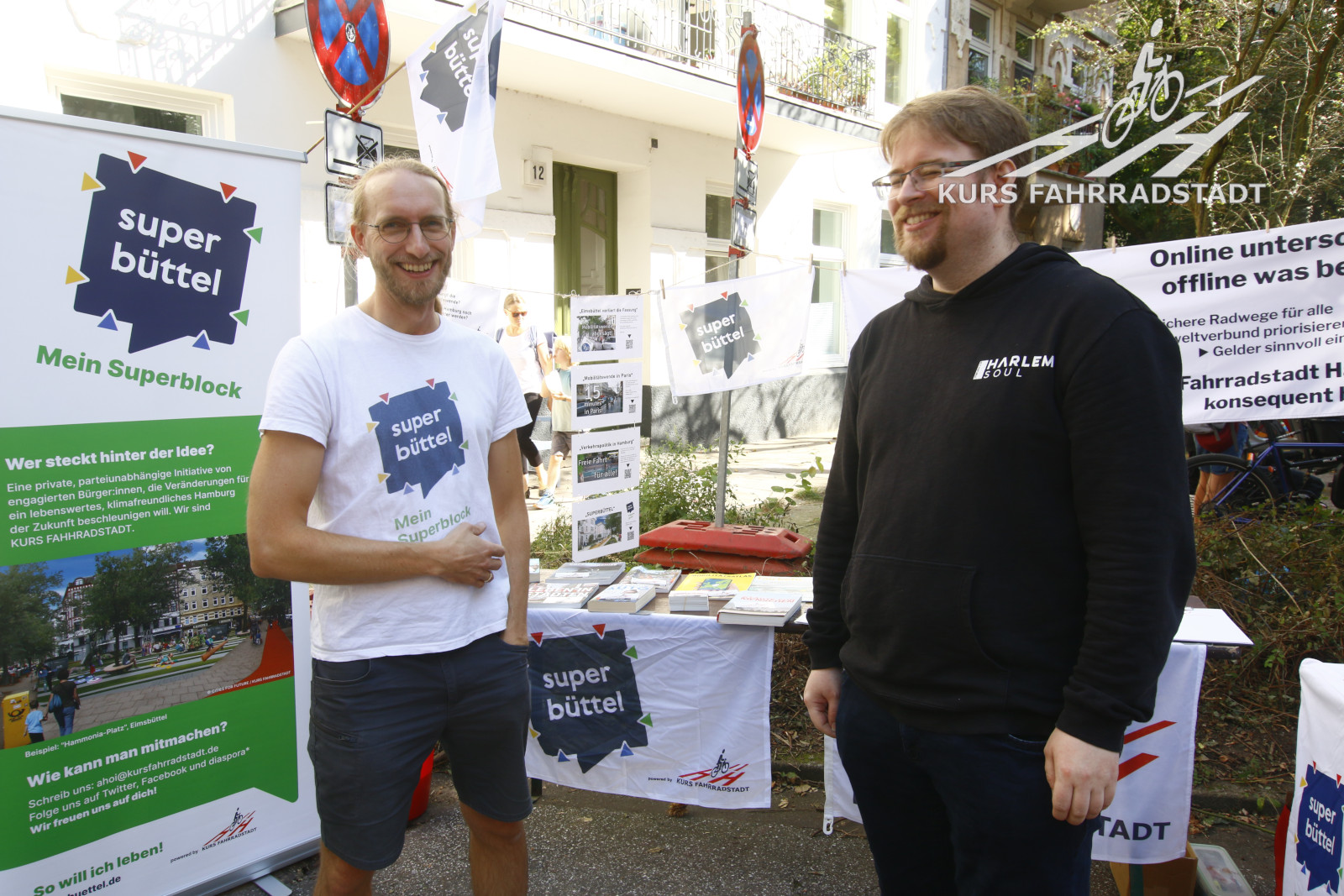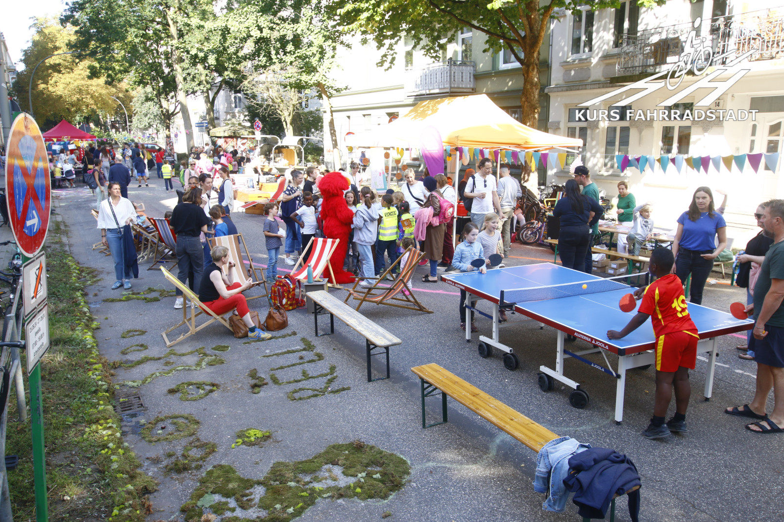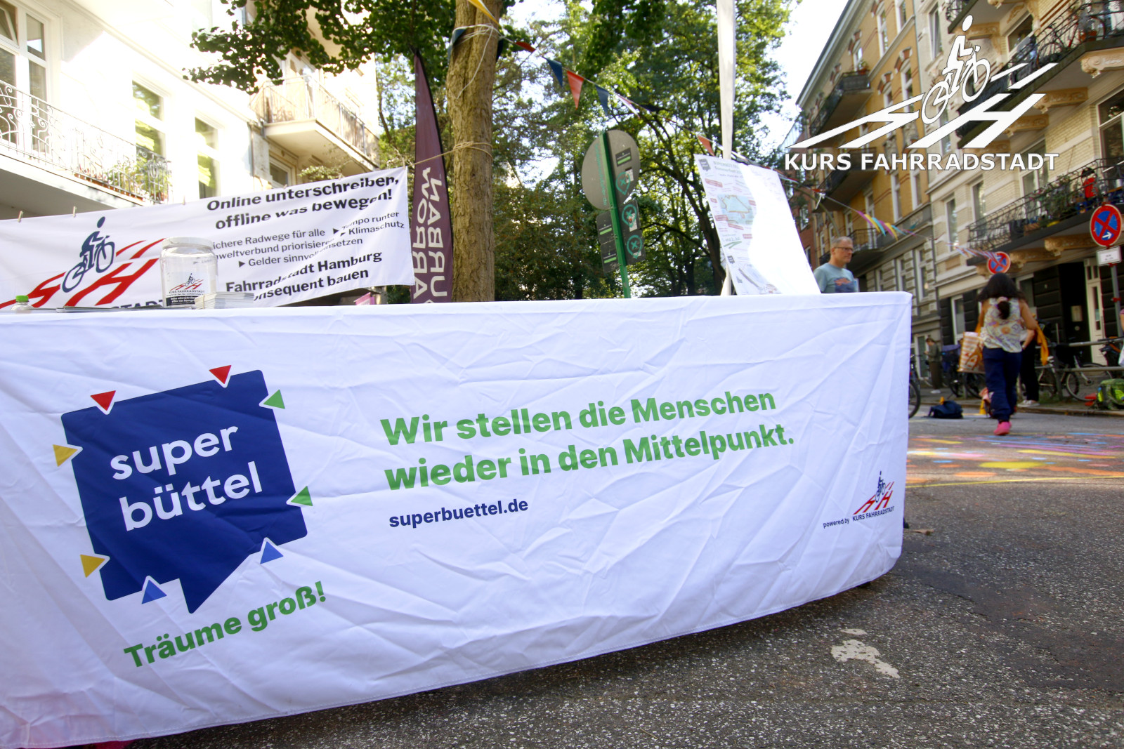 Ab Schulschluss gegen Mittag lief der Aktionstag bis abends weiter. Es gab Infostände u.a. vom Fahrradclub, vom VCD, vom HVV, der schon vormittags mit einem extra Info-Bus ebenso wie das Hamburger Unikum Verkehrskasper der Polizei dabei war, es gab einige nette Mitmachaktionen auf der Straße wie beispielsweise das Basteln von Samenbomben, für das leibliche Wohl wurde von der Alten Brotfabrik und der Elternrat-Abteilung „Fest-AG“ der Schule bestens gesorgt, Elmo wanderte als Living-Act die Festfläche ab und Riesenseifenblasen zogen immer wieder an dem großen KURS FAHRRADSTADT / SUPERBÜTTEL Infostand vorbei, denn natürlich waren wir mit von der Partie! Selbstverständlich hatte auch das Bezirksamt einen großen Stand, auf dem die inzwischen neuesten Planungszwischenstände vorgestellt und munter weiter Ideen gesammelt wurden. Was für ein Tag, was für ein Wetter und für viele tolle Besucher:innen – an dieser Stelle möchten wir den Organisierenden vom Bezirksamt unseren Dank aussprechen, die dieses Fest und überhaupt den gesamten Beteiligungsprozesses so leidenschaftlich begleiten: Wir finden, genauso sollte es viel öfter laufen. Dieser Beteiligungsprozesses sticht als leuchtendes Beispiel wohltuend aus vielen anderen hervor – danke!