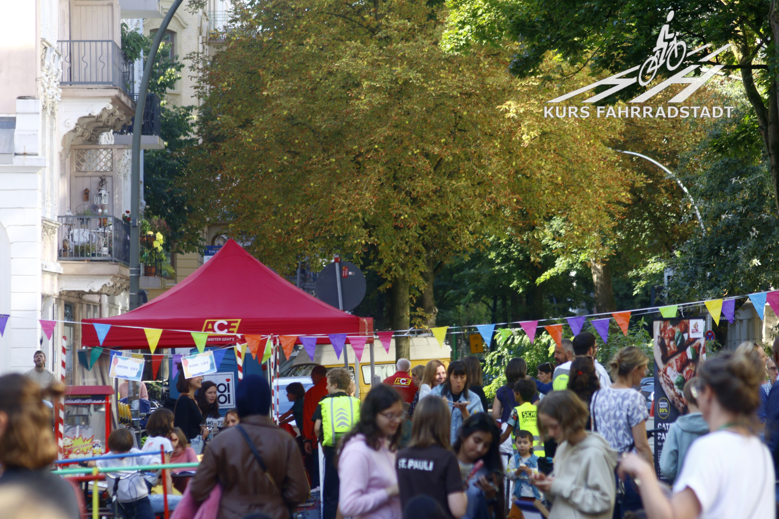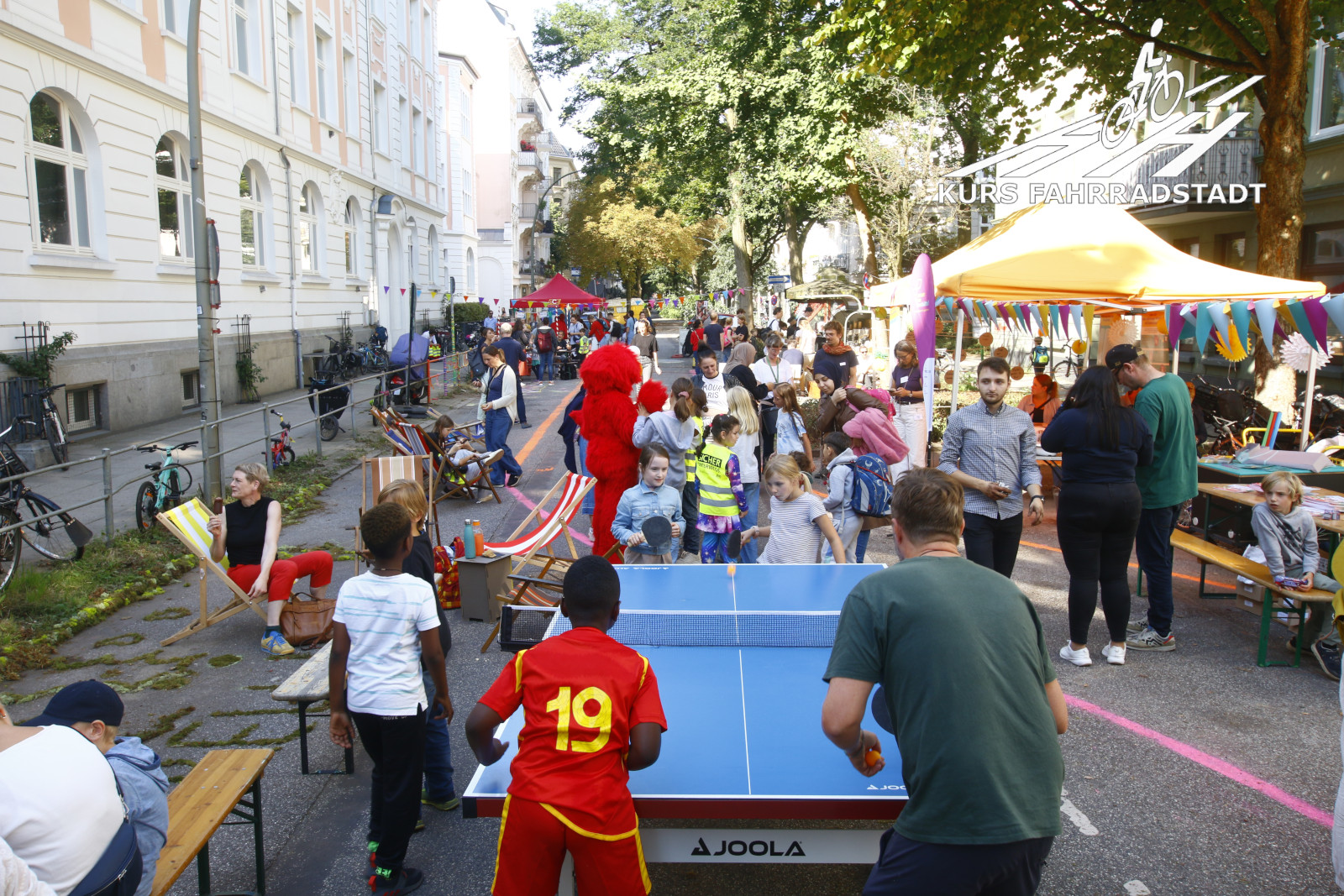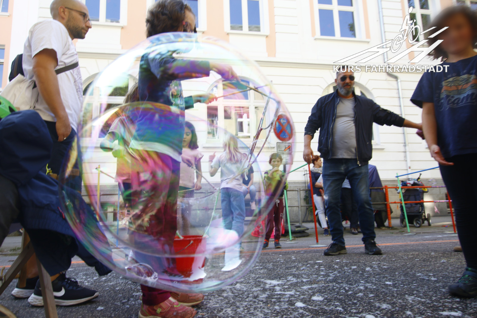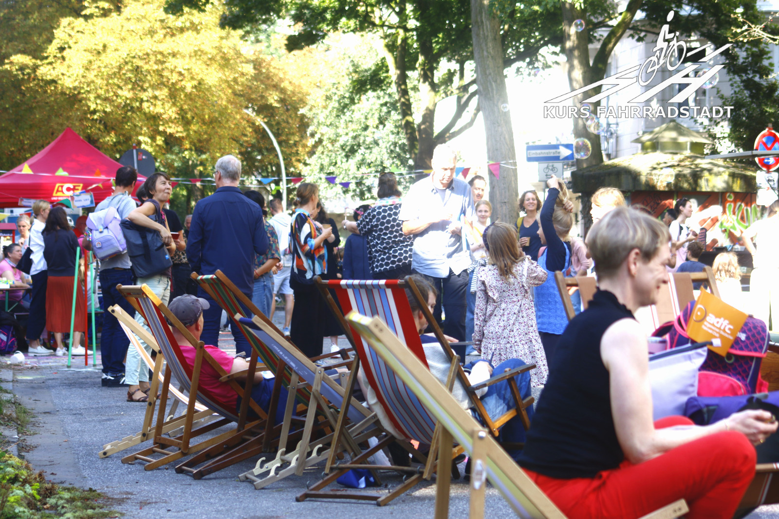 Ab Schulschluss gegen Mittag lief der Aktionstag bis abends weiter. Es gab Infostände u.a. vom Fahrradclub, vom VCD, vom HVV, der schon vormittags mit einem extra Info-Bus ebenso wie das Hamburger Unikum Verkehrskasper der Polizei dabei war, es gab einige nette Mitmachaktionen auf der Straße wie beispielsweise das Basteln von Samenbomben, für das leibliche Wohl wurde von der Alten Brotfabrik und der Elternrat-Abteilung „Fest-AG“ der Schule bestens gesorgt, Elmo wanderte als Living-Act die Festfläche ab und Riesenseifenblasen zogen immer wieder an dem großen KURS FAHRRADSTADT / SUPERBÜTTEL Infostand vorbei, denn natürlich waren wir mit von der Partie! Selbstverständlich hatte auch das Bezirksamt einen großen Stand, auf dem die inzwischen neuesten Planungszwischenstände vorgestellt und munter weiter Ideen gesammelt wurden. Was für ein Tag, was für ein Wetter und für viele tolle Besucher:innen – an dieser Stelle möchten wir den Organisierenden vom Bezirksamt unseren Dank aussprechen, die dieses Fest und überhaupt den gesamten Beteiligungsprozesses so leidenschaftlich begleiten: Wir finden, genauso sollte es viel öfter laufen. Dieser Beteiligungsprozesses sticht als leuchtendes Beispiel wohltuend aus vielen anderen hervor – danke!