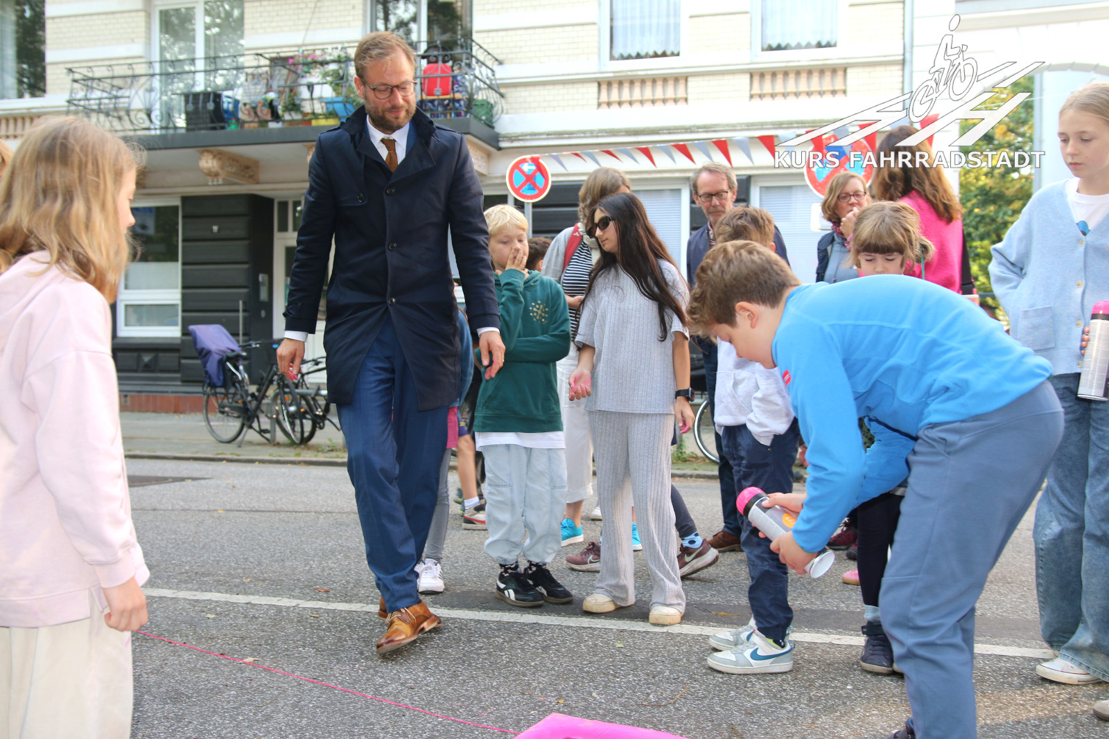 Dieser Tag sollte ein Highlight werden – und wurde es auch. Schon bei der Plandiskussionen im Juni wurde dazu aufgerufen, sich vorab aktiv am geplanten Aktionstag „Bewegung und Begegnung“ mit eigenen Aktivitätsangeboten einzubringen und wurden erste Ideen für das Straßenfest im Spätsommer gesammelt. Am 20. September war es soweit. Einen ganzen Tag lang wurde die Rellinger Straße vor der Schule auf genau dem Stück für Autos gesperrt, das hinterher dauerhaft umgestaltet wird. SUPERBÜTTEL-Feeling wehte durch die Straße, genauso wie es bei dem großen Fest war, welches wir 2021 selbst organisiert hatten. Es sollte vorstellbar werden, was die erarbeiteten Pläne etwa bewirken würden und wurde letztlich noch viel mehr als das: Der Tag wurde bewusst gewählt, es ist der Weltkindertag und alles begann damit, dass am Vormittag hoher Besuch kam. Der Verkehrs- und Mobilitätswendesenator Anjes Tjarks (Grüne) besuchte das Fest auf dem Schulhof und der Straße. Im Rahmen der Aktionswochen „Zu Fuß zur Schule“ wurde die Schule „Relli“ aus gegebenen Gründen dieses Jahr ausgesucht, um das jährliche Schulbehördenprojekt rund um den Start ins neue Schuljahr prominent in Szene zu setzen. Die Schülerinnen und Schüler machten dann so etwas wie den ersten Spatenstich für den kommenden Umbau: Mit Sprühkreide in den Händen zauberten sie einen bunten Übergang über den geplanten Radweg (der ebenfalls auf dem Asphalt angedeutet wurde) unmittelbar vor dem Schuleingang auf die Straße und der Senator half mit – was für eine nette Idee!