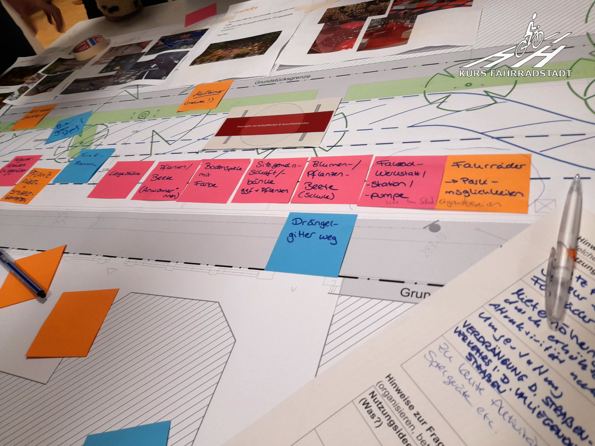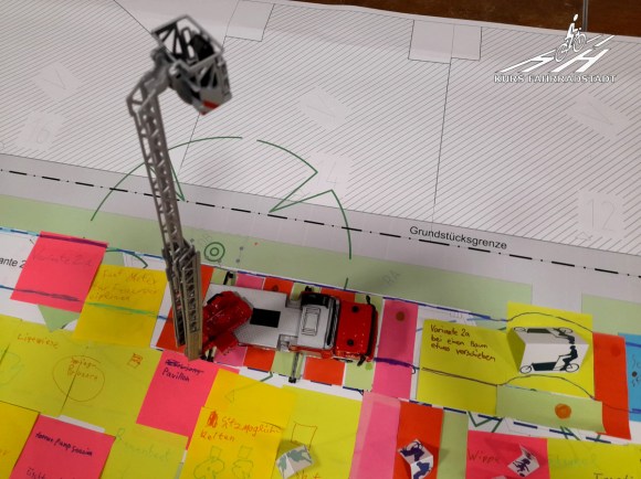 Den zweiten Punkt bringen wir ein, nämlich, dass es ein ‚richtig guter‘ Workshop sein sollte. Damit das gelingt, sollte unbedingt eine inspirierende Atmosphäre geschaffen werden. Bisher kennen wir derartige Workshops der Stadt oft als Veranstaltung in kahlen Räumen mit jeder Menge weißem Papier, auf den Ideen gesammelt und skizziert werden sollen, aber es gibt nichts, woran man sich orientieren oder festhalten könnte. Wer mit der Materie nicht vertraut ist, dem fällt überspitzt gesagt im besten Fall höchstens ein, dass man vielleicht irgendwo eine Bank und einen Müllkorb aufstellen könne – schlicht weil die Teilnehmenden keine Vorstellung davon haben, was theoretisch tatsächlich alles möglich wäre. Woher sollten sie es wissen oder kennen, wenn es das in diesem Land nur selten zu sehen gibt, insbesondere wenn es um Straßen in reinen Wohngebieten, also abseits von Geschäftsstraßen geht. Darum bitten wir darum, Stellwände bspw. mit vielen Fotos als Positivbeispielen vor allem auch aus dem Ausland einzusetzen, um als gute Basis einen Rahmen zu schaffen, der anregend wirken soll. Zudem bitten wir darum, dass die Workshopteilnehmenden die Möglichkeit erhalten sollten, unbedingt an möglichst großen, maßstabgetreuen Plänen die Straße selbst mit Klötzchen, Schnipseln, Stiften oder Ähnlichem planen zu können. Auch dieser Punkt wird aufgenommen.