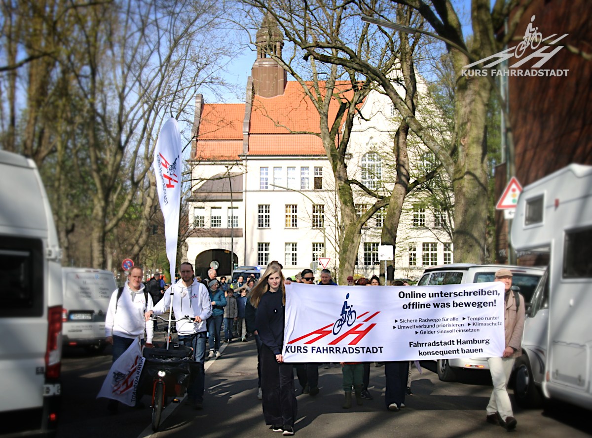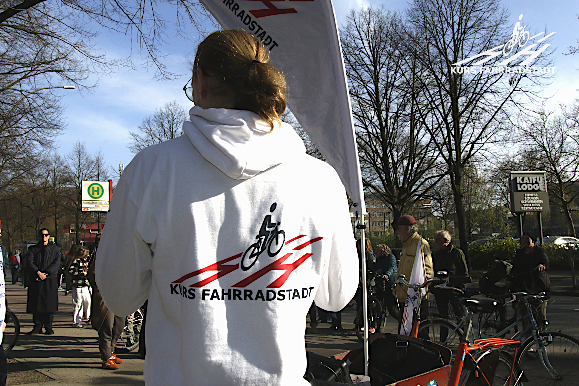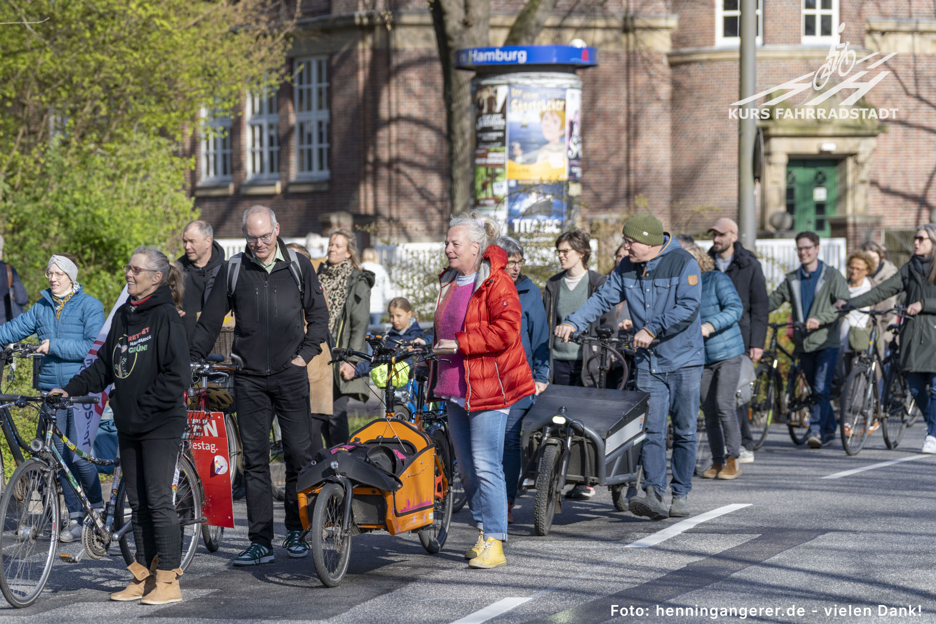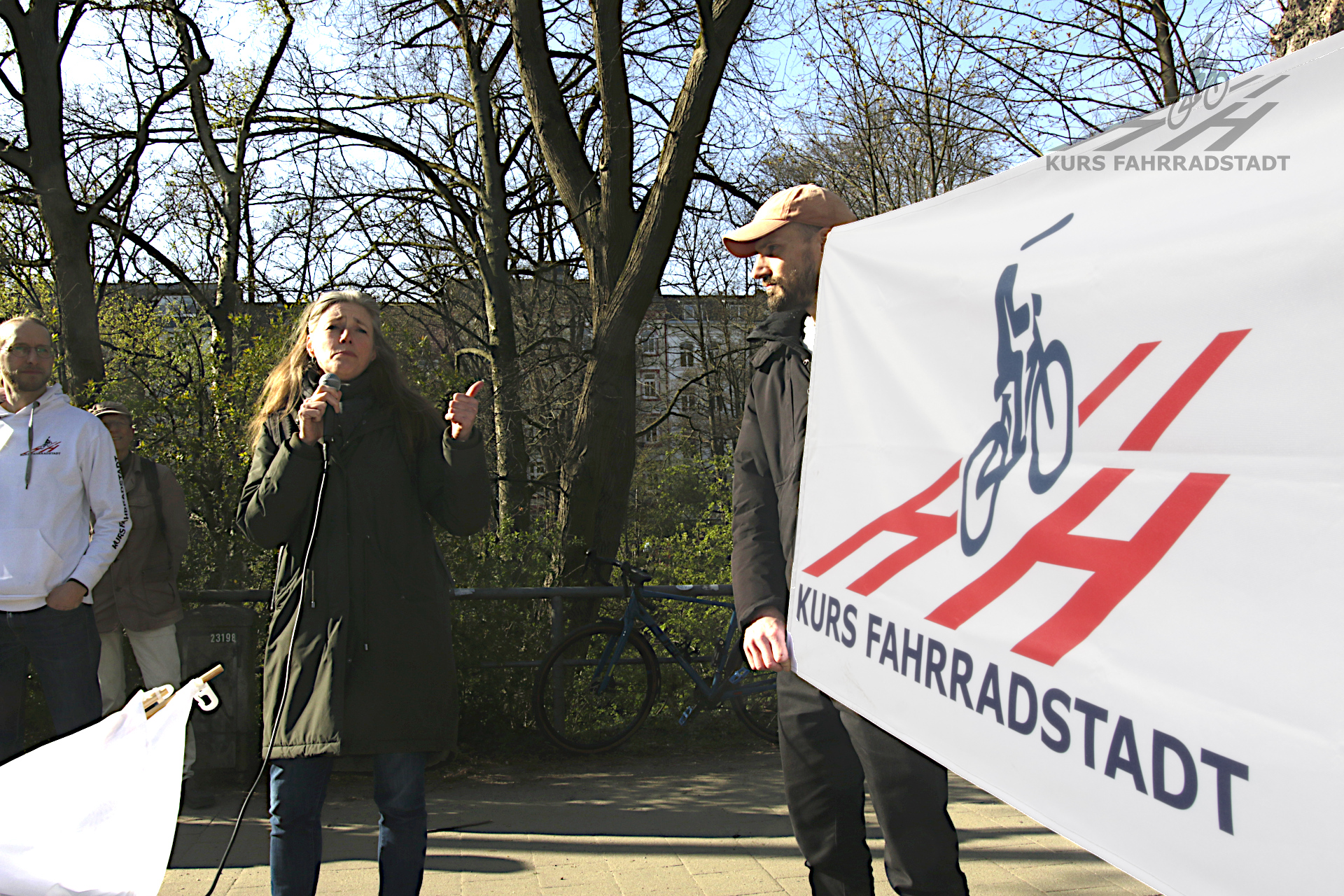 Am Montag, 14. April, standen Entscheidungen im KGA (Kerngebietsausschuss im Bezirksamt Eimsbüttel) an. Dabei ging es um beide gerade erwähnten Dinge. Hier könnt ihr nachlesen, worum genau es da geht und was die Hintergründe für unser Handeln waren; immerhin war KURS FAHRRADSTADT nach längerer Zeit darum am 10. April wieder mit einer Demo auf den Straßen Eimsbüttels unterwegs.