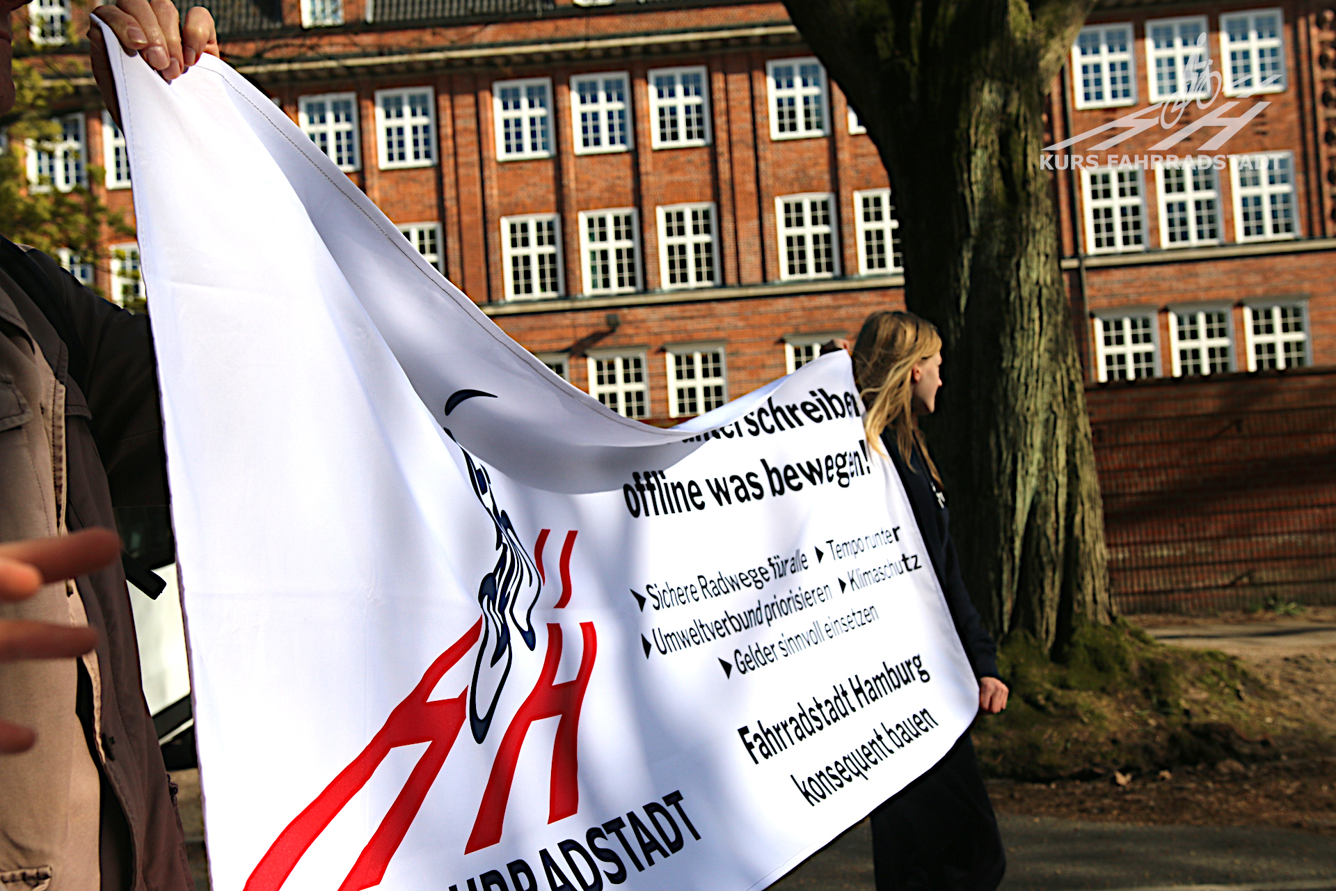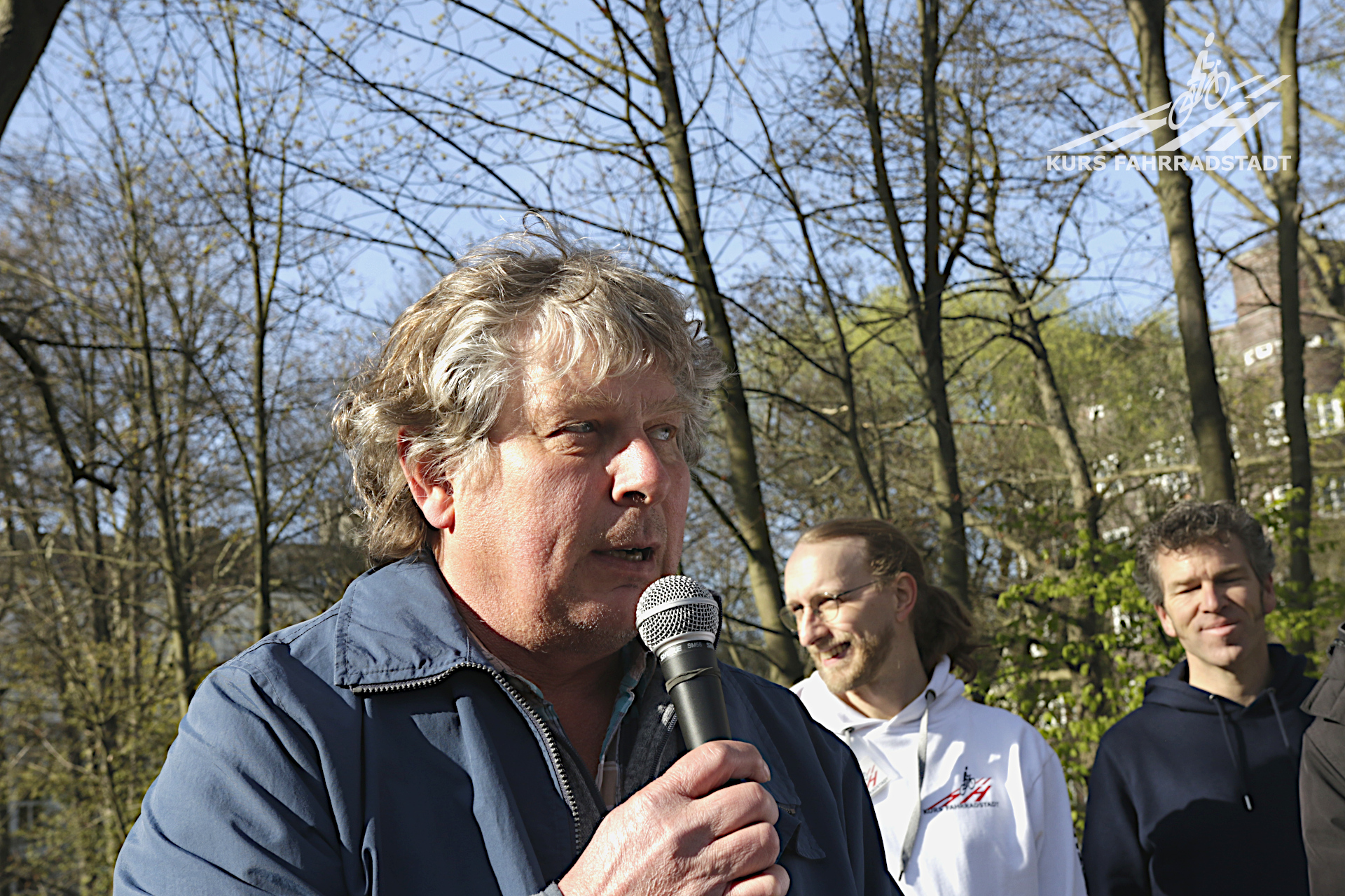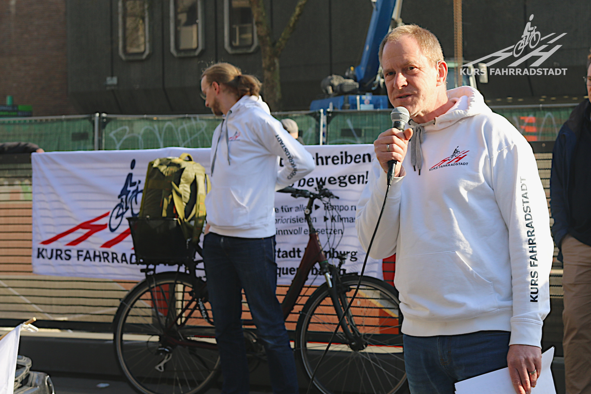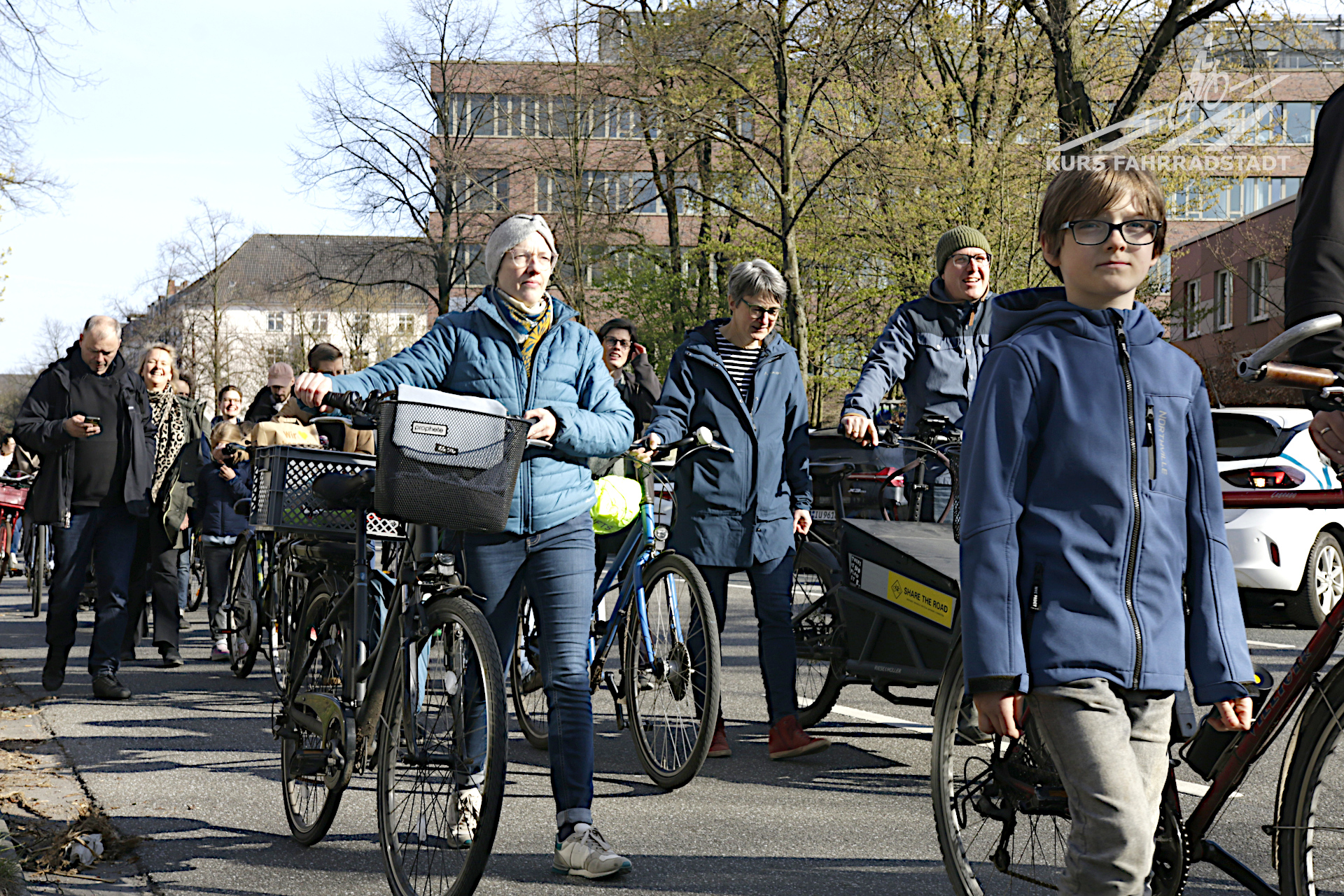 Am Montag, 14. April, standen Entscheidungen im KGA (Kerngebietsausschuss im Bezirksamt Eimsbüttel) an. Dabei ging es um beide gerade erwähnten Dinge. Hier könnt ihr nachlesen, worum genau es da geht und was die Hintergründe für unser Handeln waren; immerhin war KURS FAHRRADSTADT nach längerer Zeit darum am 10. April wieder mit einer Demo auf den Straßen Eimsbüttels unterwegs.