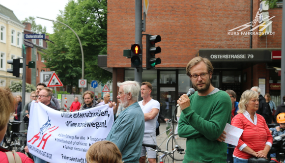Nach einem tödlichen Unfall marschiert KURS FAHRRADSTADT am 19. Mai 2018 durch ganz Eimsbüttel. Der heutige Verkehrs- und Mobilitätswende-Senator Anjes Tjarks hält eine bewegende Rede.