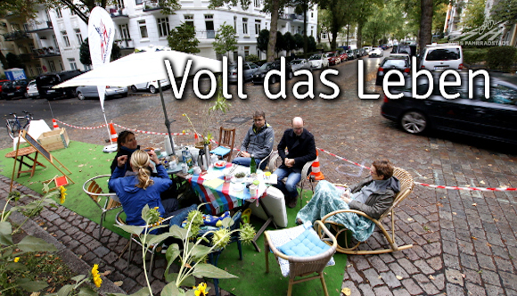 Rollrasen, Sonnenschirme und Schaukelstuhl auf die Parkplätze – schon ist der umgewidmete Parkplatz ein netter Nachbartreffpunkt.