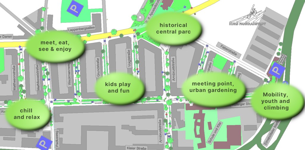 In den Plänen ist das Superbüttel während der ersten Entstehungsphase zu sehen. Nach dieser Zeit erfolgen weitere Anpassungen durch zusätzliche Umwandlungen von Parkplätzen in Qualitäts-Aufenthalts- und Grünflächen, in weitere Mobility-Stationen, effektive Fahrradabstellanlagen sowie zu weiteren Besucher-, Be- und Entladeparkplätzen. Mehr dazu, wie ein Superbüttel entstehen kann, findest du auf unserer Hintergrund / Faktenseite.